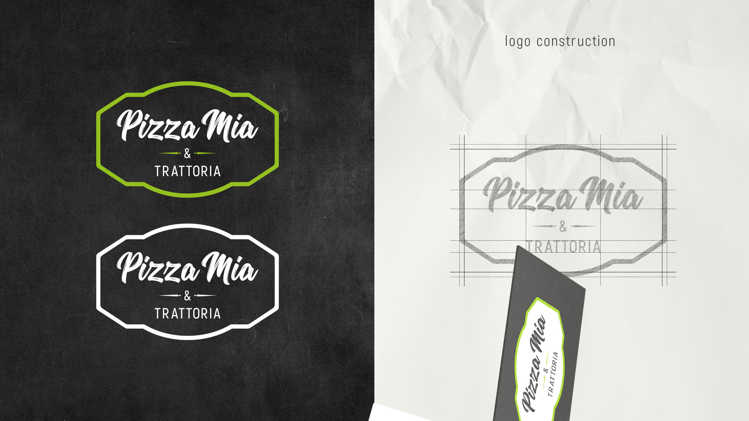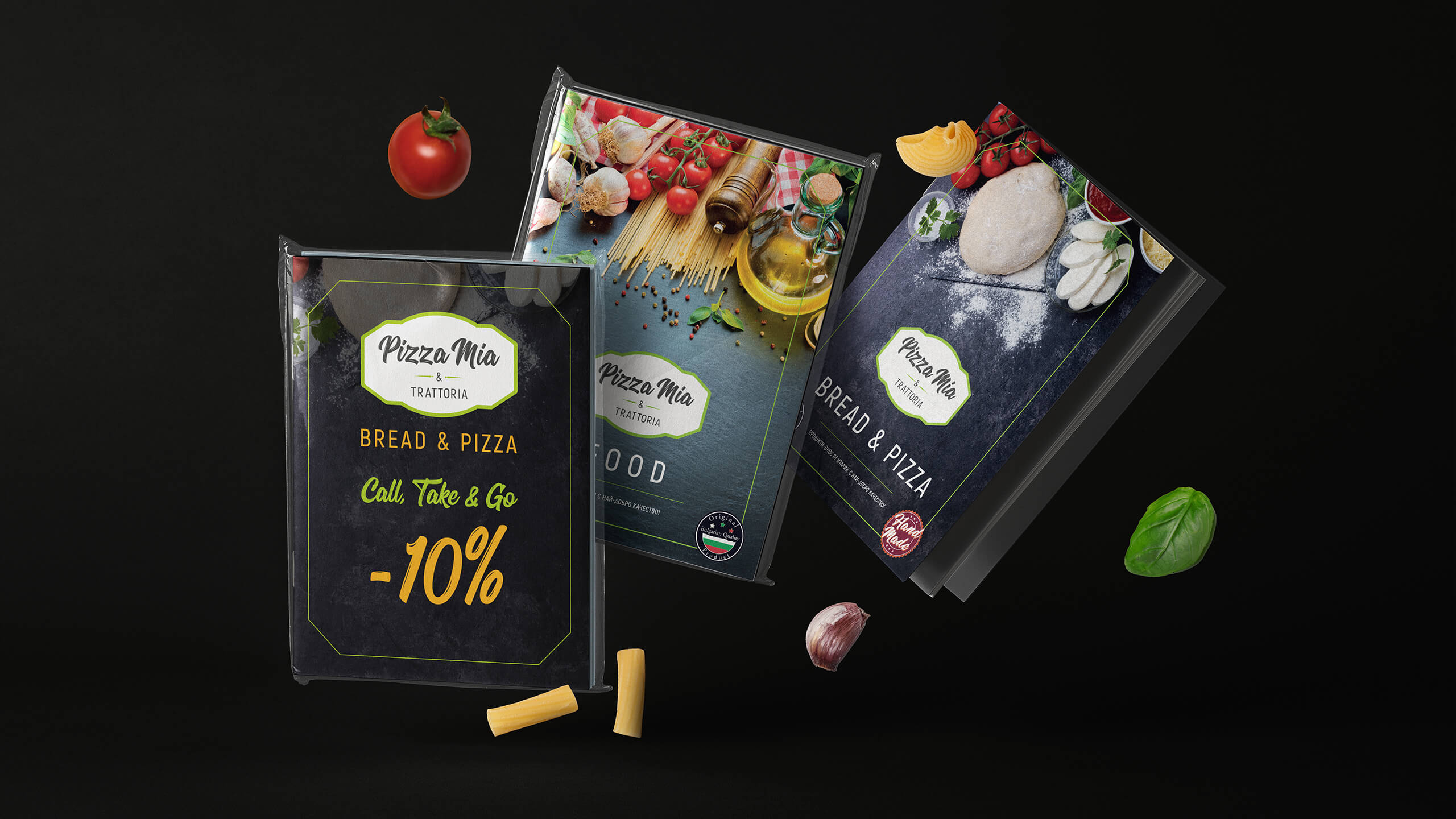 We started working on the project by creating the logo of Pizza Mia & Trattoria. Inspired by Italian cuisines, our designers developed three different design concepts for the logo. For each concept, a series of visualizations of advertising materials for the restaurant business were presented. After choosing their new logo, Pizza Mia & Trattoria assigned us the design and the production of print materials for the restaurant. We organized a product photosession of the offered dishes and we featured the photos in the menu of the restaurant. We developed several menus and brochures for the restaurant, as well as additional promotional materials for its interior.