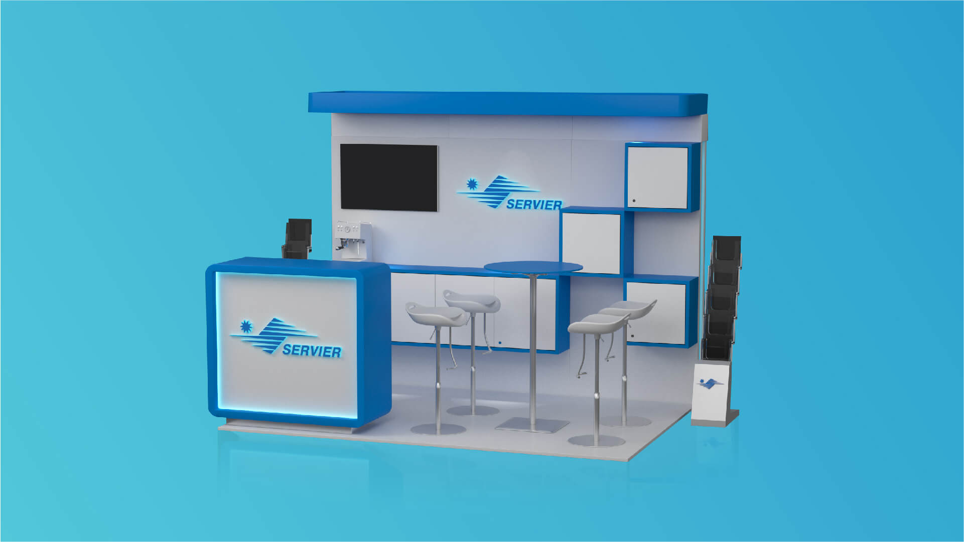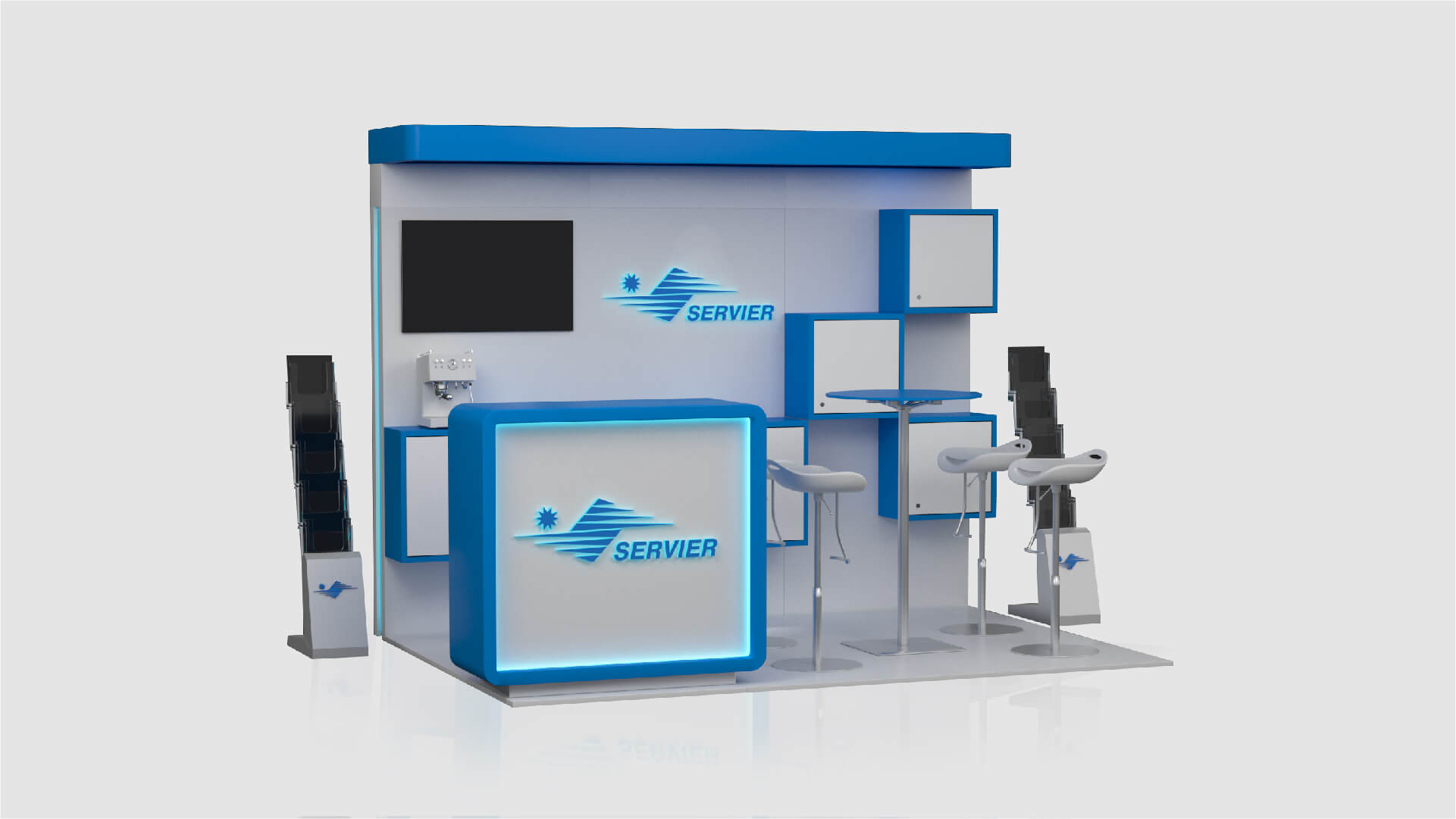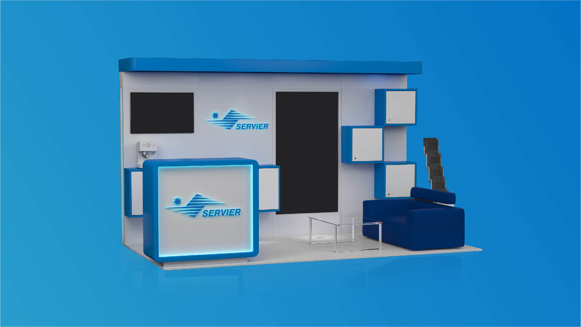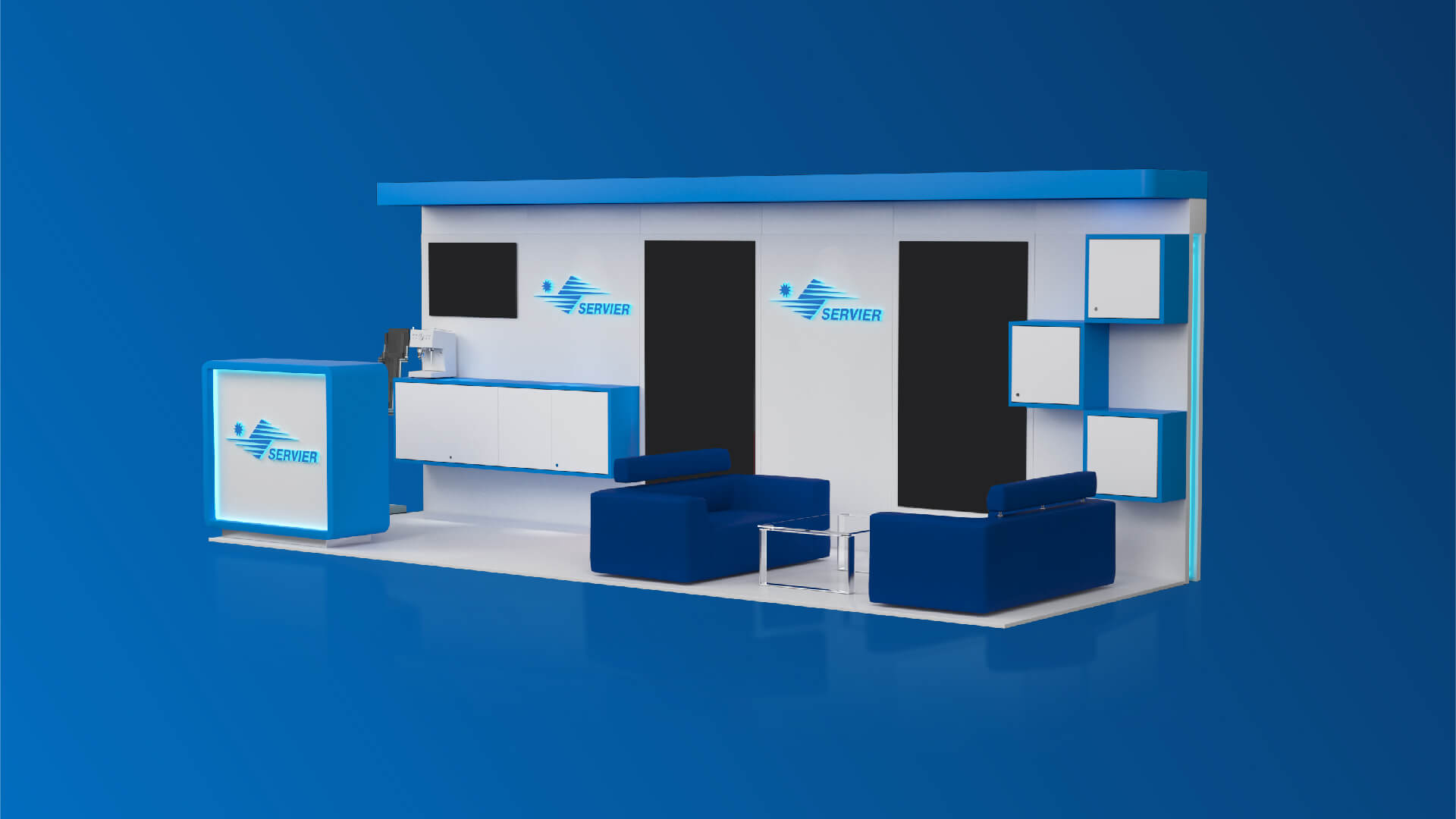 We got familiar with Servier's corporate design standards and then we started outlining our project development ideas. After two weeks of hard work, we presented our proposal for a modular exhibition stand to the client. It included the integration of 2 digital walls for presentation and an additional LCD TV, as well as a combination of luxury furniture, storage cabinets and a reception. We managed to fit all that in only 12 m2 and keep comfortable empty spaces on the stand in the same time.